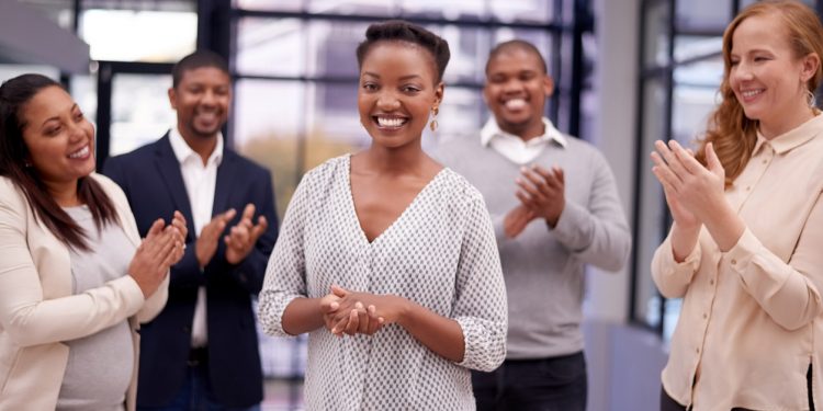 Shot of a young businesswoman being applauded by her colleagues in a modern office